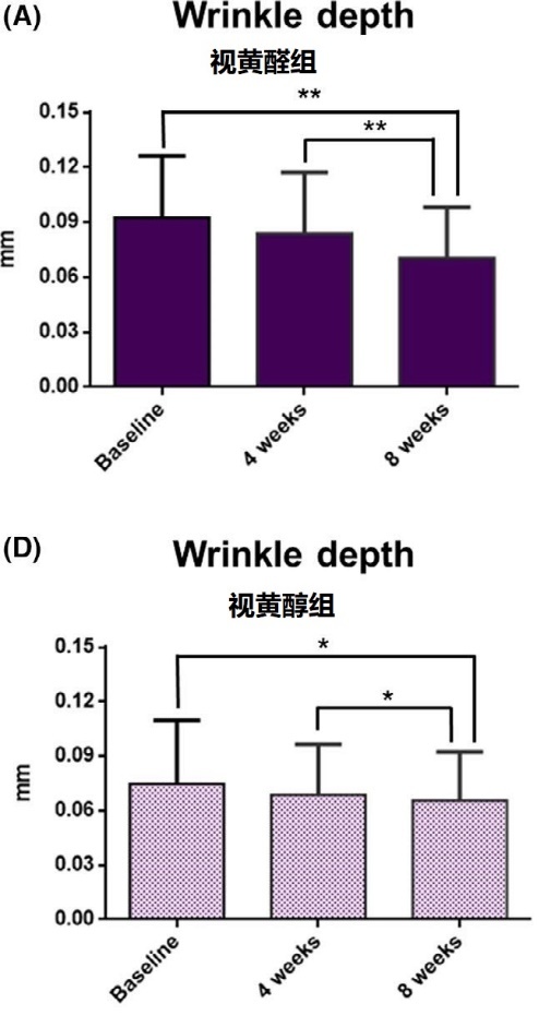 受試者的(de)魚尾紋深度用(yòng)Antera 3D相(xiàng)機(jī)測量,結果兩組的∏♥(de)深度均有(yǒu)減少(shǎo),其中視(shì)黃(hu™↓áng)醇半臉8周後減少(shǎo)10.27%,視(shì)σ∏黃(huáng)醛半臉減少(shǎo)23.7%,差距有(yǒu∞↕)統計(jì)學意義(p = 0.001):
