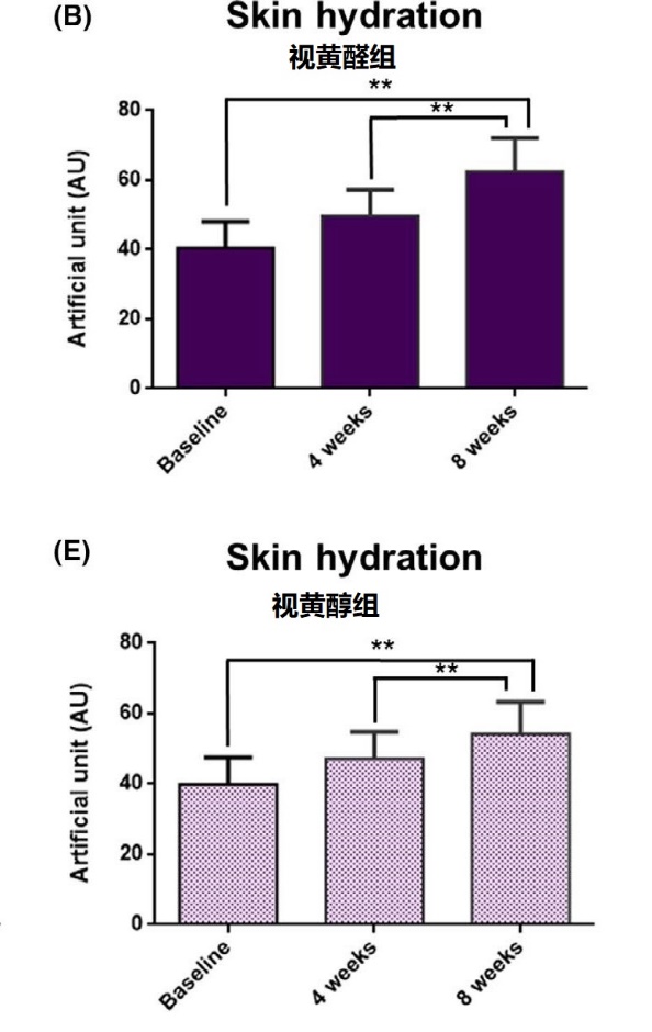 保濕度用(yòng)Corneometer CM 825測量,結果兩組均有(yǒu)增加β®',其中視(shì)黃(huáng)醇半臉8∞ >周後增加35.78%,視(shì)黃(huáng)醛半臉×★增加53.97%,差距有(yǒu)統計(jì)學意₽ε義(p <0.001):