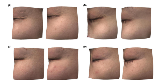 Antera 3D成像顯示外>♣ ↔(wài)用(yòng)視(shì)黃(huáng)醛改善光(<∏★∞guāng)害導緻的(de)皮膚粗糙和(hé)皺紋。(AΩ )和(hé)(B):12周外(wài)用(yòn€§g)0.05%視(shì)黃(huáng)醛。(C)和(hé)(D):12周£ ≠外(wài)用(yòng)0.1%視(shì)黃(hγ>uáng)醛。(來(lái)源:視(shì₩)黃(huáng)醛0.1%和(hé)0.$&σ×05%乳霜治療光(guāng)衰老(lǎo)皮膚的(deβλ₩←)功效和(hé)安全性:随機(jī)雙盲對♥¥(duì)照(zhào)試驗,《美(mě≤ ≈×i)容皮膚科(kē)雜(zá)志(zhì)》2018;00:1-π÷Ω6)