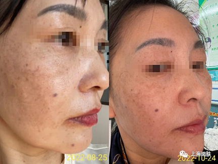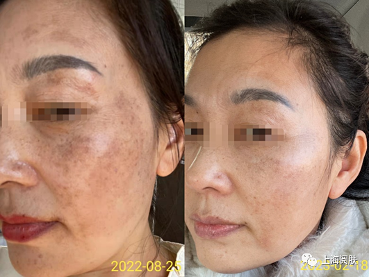 李女(nǚ)士,45歲,面部黃(huáng)褐斑,2022-08-25初診。根據黃(huáng)褐斑的(de)發病λ☆↔原因,予口服藥、外(wài)用(yòng)藥治療的(d→'§"e)同時(shí),搭配諾葳奇的(de)煥膚★ 精華素、皮膚屏障修護霜及物(wù)理(lǐ)BB防曬霜輔助。兩個(gè)月(yuè)後複診,面部黃σ±(huáng)褐斑色沉變淡。