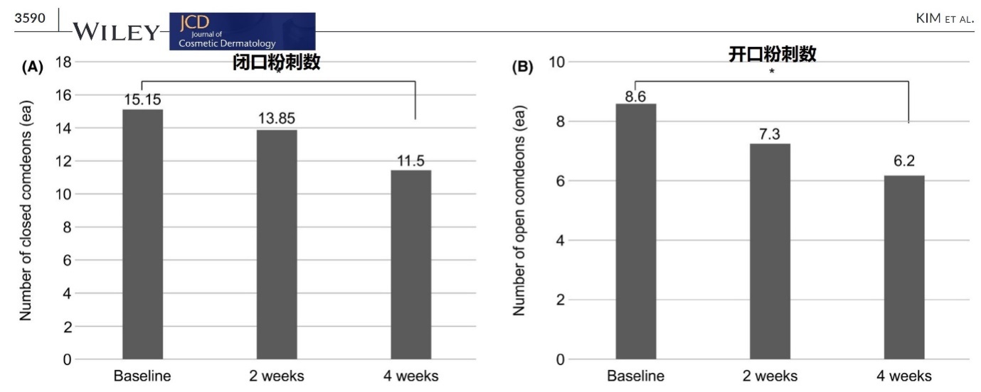 受試者的(de)粉刺數(shù)由研究員(yuán)肉眼計<♠(jì)算(suàn)。4周後閉口粉刺減少(shǎo)24.01%(p < 0.001),開(kāi)口粉刺減少(sh↑λǎo)27.1%(p < 0.001):