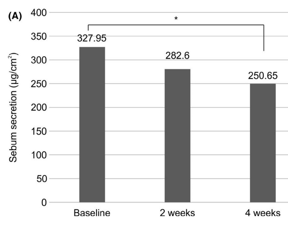 皮脂量用(yòng)Sebumeter SM 8155測量,4周後減少(shǎo)2&ε3.57%(p < 0.001):