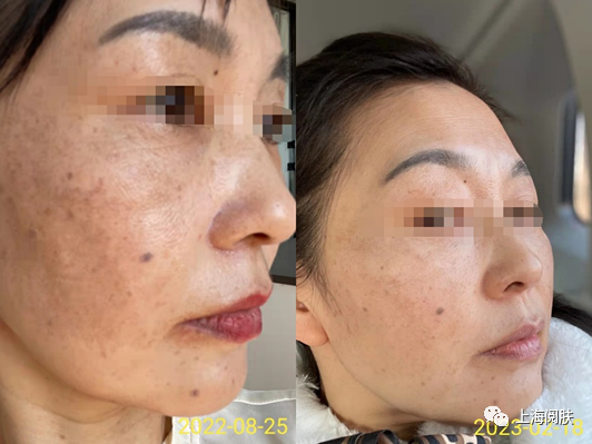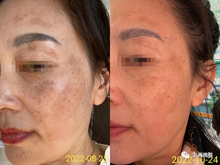李女(nǚ)士,45歲,面部黃(huáng)褐斑,2022-08-25初診。根據黃(huáng)褐斑的(de)發病λ☆↔原因,予口服藥、外(wài)用(yòng)藥治療的(d→'§"e)同時(shí),搭配諾葳奇的(de)煥膚★ 精華素、皮膚屏障修護霜及物(wù)理(lǐ)BB防曬霜輔助。兩個(gè)月(yuè)後複診,面部黃σ±(huáng)褐斑色沉變淡。