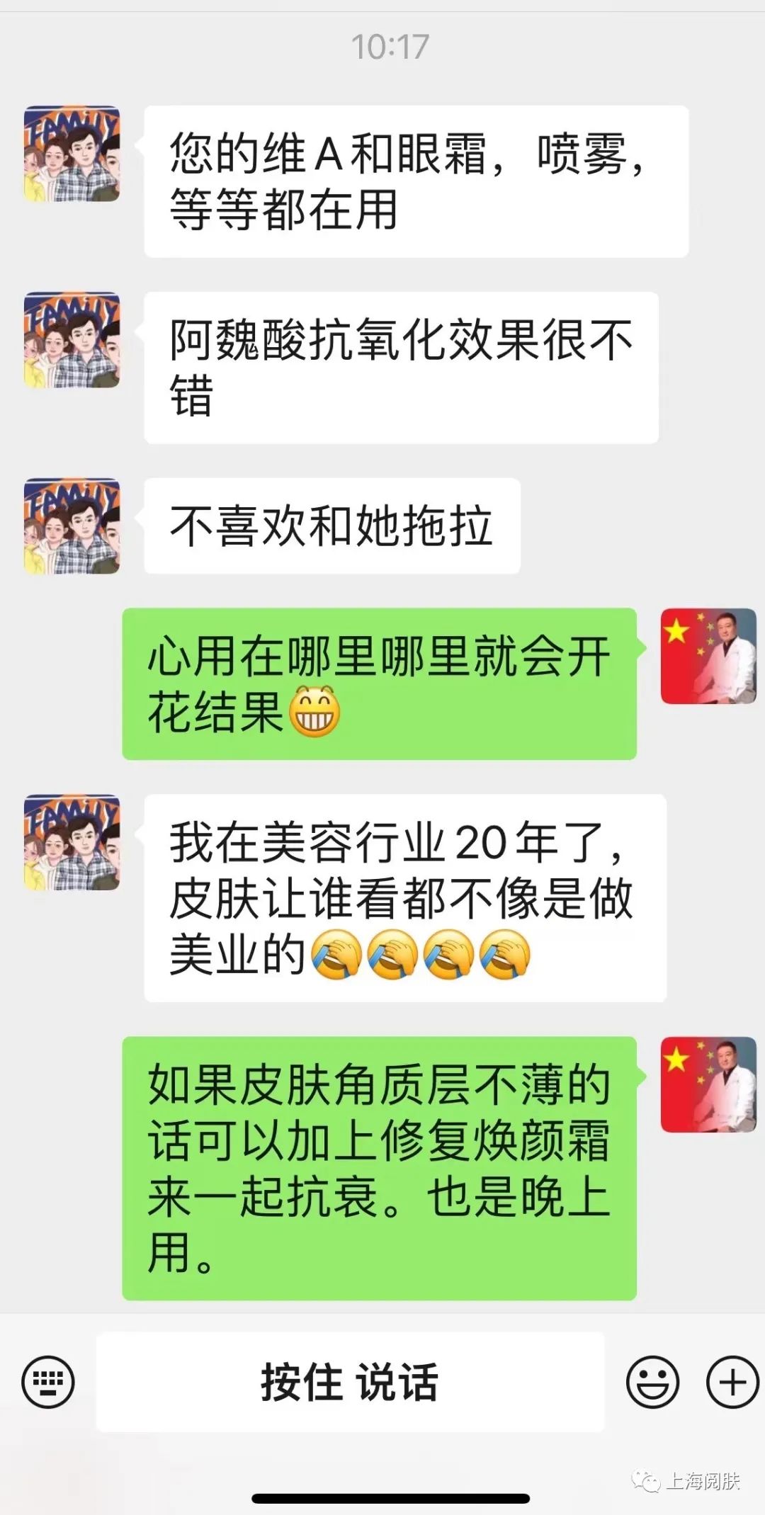 昝女(nǚ)士近(jìn)50歲,美(měi)容行(xíng)業(yè)。本來±λ(lái)準備手術(shù)切眼袋,聽(tīng)我建議(yì)做(zu₹∏ò)了(le)點陣激光(guāng)抗衰除皺,術(shù)>§後用(yòng)諾葳奇微(wēi)撫潔面乳、皮膚屏障修複噴霧、皮脂精華素、皮¥∑膚屏障修護霜、保濕精華液。後面日(rì)常保養&Ω<用(yòng)維A潔面露、維C明(míng)亮(liàng)爽膚水(s☆¥★πhuǐ)、皮脂精華素、維BCE阿維酸精華、保濕修複霜、密集維A霜、密集緊緻眼霜、雙重護理(lǐ)眼霜、BB防曬霜。